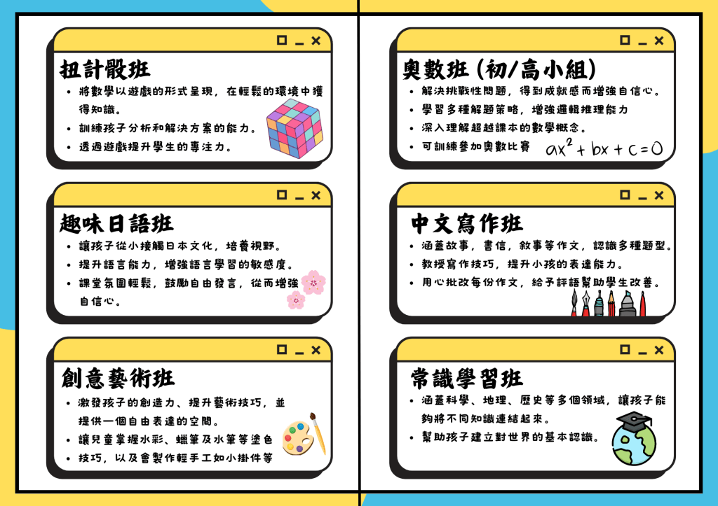 日語班/奧數班/ 英語國際音標班/ 扭計骰班/ 創意藝術班/中文寫作班