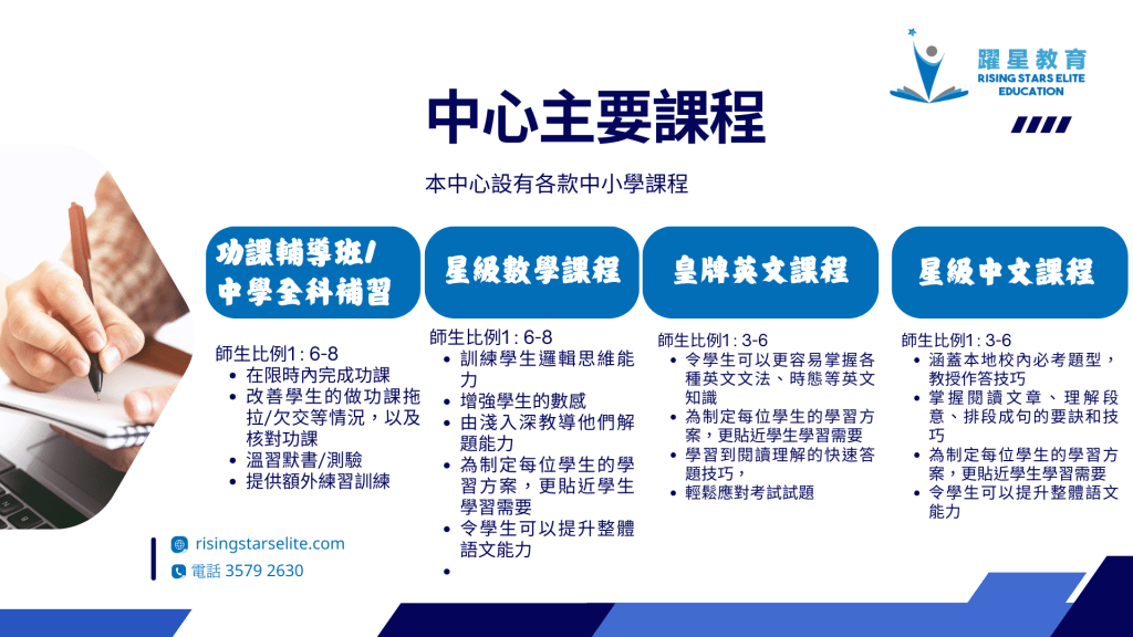 躍星教育位於香港天后的補習社,提供K3-S6課程,包括功課輔導班、英文專科班、數學專科班、中文專科班、英文拼音班Phonics,以合適教學方式及策略,協助及解決學生不同學習需要。